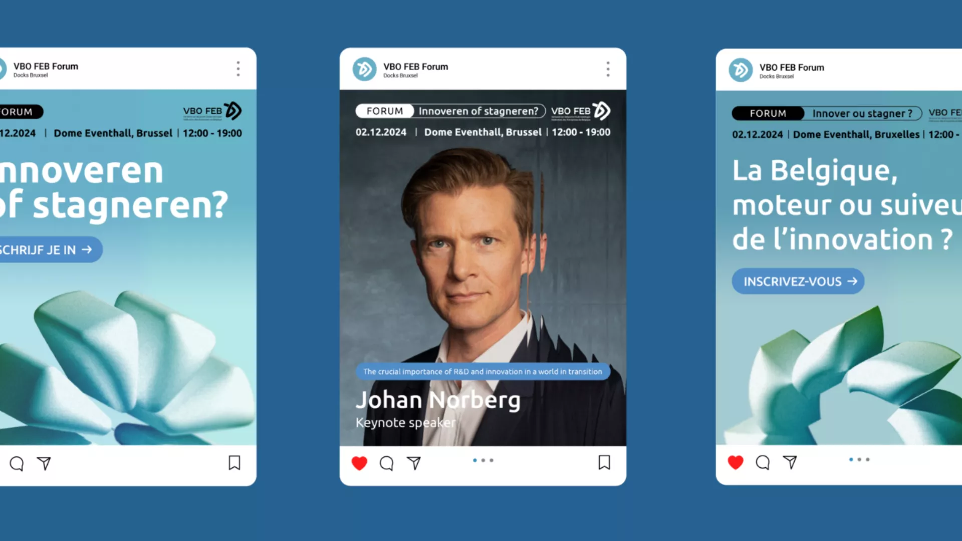 From event branding and online promotion to signage and dynamic avatars. We teamed up with VBO-FEB to bring their forum to life. Centered around the sharp question innovation or stagnation?, the concept invited participants to reflect, connect and move forward.